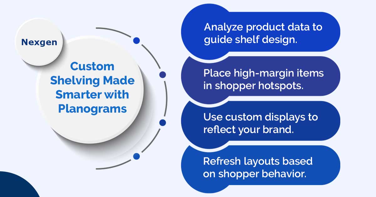 - Monitor and refine regularly: Once custom shelves are in place, continuously monitor their performance using sales data and shopper feedback. Update your planogram to reflect shifts in demand, ensuring your shelves remain relevant and effective. A spike in demand for healthy foods might prompt you to redesign a dedicated section for these items.
