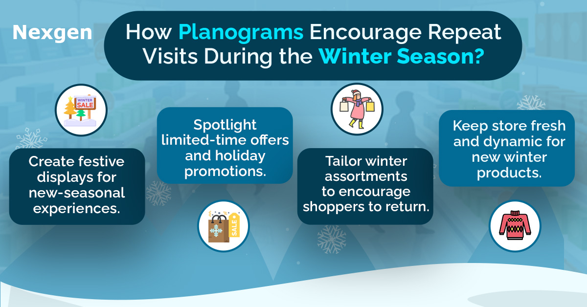 The winter season is synonymous with festive decorations, cozy atmospheres, and the spirit of giving. Planograms allow retailers to arrange their store shelves and displays in a way that captures this seasonal charm. By using planograms to highlight seasonal products—whether it is holiday-themed goods, winter apparel, or special offers - retailers can create a visually appealing environment that entices customers to return for new experiences, products, or promotions.